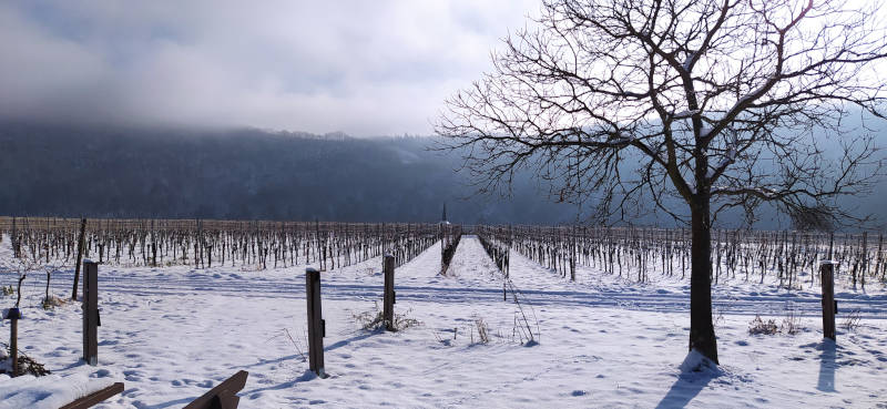 Schneebedeckte Reben, Winterwetter, wunderschön präsentiert sich die Landschaft. Ein Spaziergang entlang der Weinberge, gut eingepackt bei kalten Temperaturen, einfach zauberhaft.